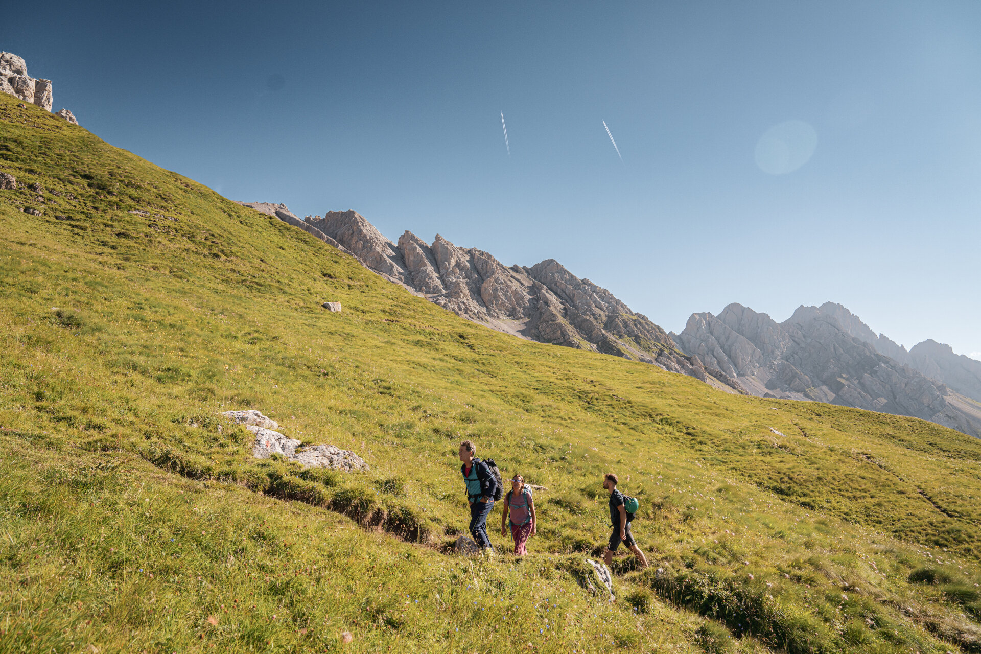 Latemar, Rosengarten, Langkofel, Sella, Monzoni und Marmolada. Im Sommer enden die Wanderungen in den Dolomiten nie.