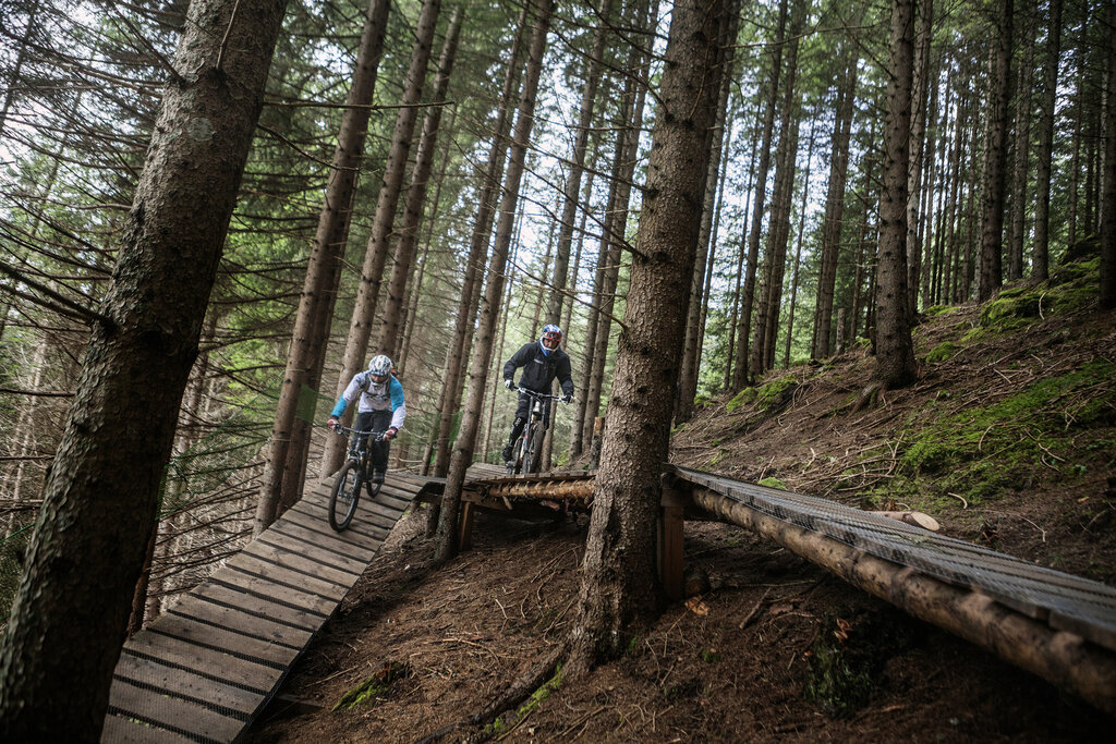 Der kürzeste Trail ist 600 Meter lang und hat einen Höhenunterschied von 60 Metern. Der längste erreicht mit 710 Metern Höhenunterschied mehr als 5 Kilometer. Dazwischen Sprünge, Tropfen, Flow-Linien, schnelle Strecken, Parabolkurven, Strukturen im Stil der Nordküste, die sich entlang der Skipisten und Wälder des Gebiets zwischen Col Rodella (Campitello) und Belvedere (Canazei) entwickeln. Nicht zu unterschätzender Aspekt: Der Fassa Bike Park wird von schnellen Kabinenbahnen, Sesselliften und Seilbahnen bedient. Dolomiten, Wiesen, Schotter, Wälder, Schlamm: Das dürfen sich Gravity-Fans im Val di Fassa nicht entgehen lassen. Die meiste Zeit steht der Fahrer auf den Pedalen, die Arme dämpfen die Unebenheiten des Geländes, die Hände sind fest auf dem Lenker und die Finger immer bereit auf den Bremsen. Zu Beginn verlässt man sich auf die Instruktoren der Fassa Bike MTB School, um von Anfang an die Regeln des Spiels zu erlernen. Natürlich muss man ein wenig waghalsig sein, schnelle Reflexe haben, wissen, wie man mit dem Mountainbike umgeht, und vor allem die maximale Konzentration während der Abfahrt aufrechterhalten.