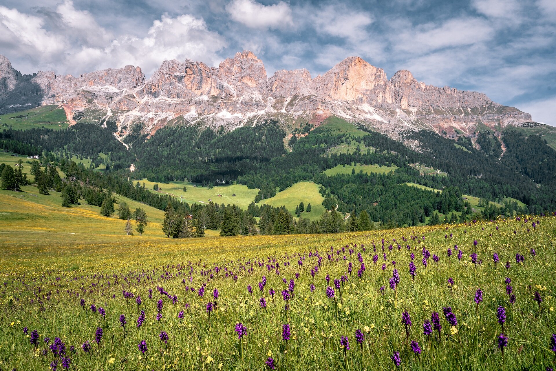 Gleich hinter dem Pass verbirgt sich der Karersee, ein kleines Dolomitenjuwel direkt unter den Hängen des Latemars, dessen imposante Gipfel sich im kristallklaren Wasser des Beckens spiegeln. Weit in der Ferne können Sie eine Blick auf das Grand Hotel Carezza erhaschen, eine imposante Struktur, die berühmte Persönlichkeiten wie Prinzessin Sissi, Winston Churchill und Agatha Christie beherbergte, die diesen Ort als Kulisse für ihre Romane „Poirot“ und „Die Großen Vier“ wählte.