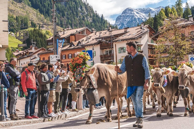 L’autunno è la stagione delle raccolte dei frutti più preziose, quelle che profumano di bosco. Mentre le Dolomiti esplodono di profumi e colori, in Val di Fassa l’autunno è soprattutto il mese del ritorno. Dagli alpeggi in alta quota, i pastori portano il meglio dei formaggi preparati con il latte dei fiori dell’estate. Le vacche, che li seguono, sfilano in corteo addobbate da regine e, nei borghi, si canta, si danza, si festeggia! Prima della stagione del freddo, come un tempo, ogni comunità celebra il suo capodanno di luce e le piazze si adornano di prodotti e ricette che di autentico mantengono intatta l’intensità del sapore.